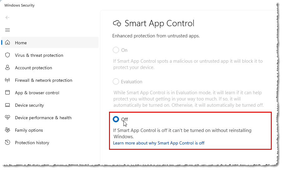 Symptom: Starting with Windows 11 (version 22H2 or 23H2), a Windows app called Smart App Control is often enabled by default and causes issues.